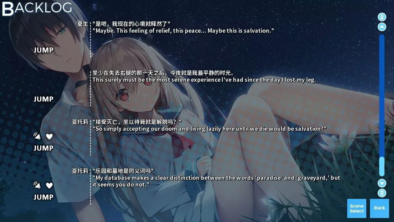 ATRI是一部很优秀的作品。故事中的描写节奏缓慢,但饱含真情。从平日生活中与人物逐渐产生共情,在事件点产生共鸣。有很多泪点,中途有几次想落泪。但是沟槽的剧情设置,在泪点的时候预留时间太短了,或是后续切换太快,没流出来,要出来了又给按回去了。